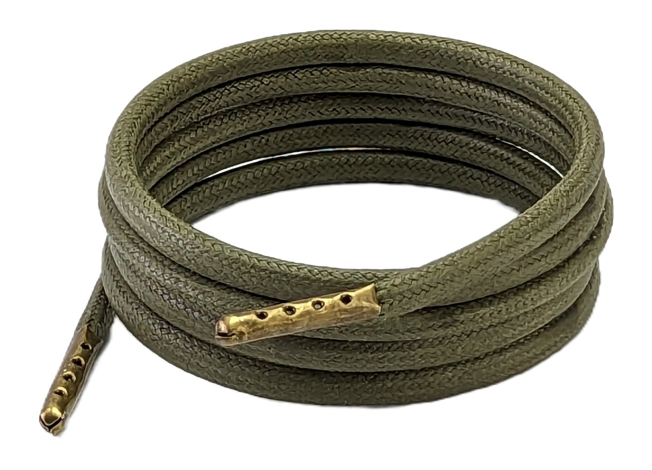Buy online shoe & Boot laces Khaki Green 4 mm round high quantity cotton shoe & Boot laces with coated Bees wax to give added Durability finish with bronze metal tips to give any footwear the perfect finish.